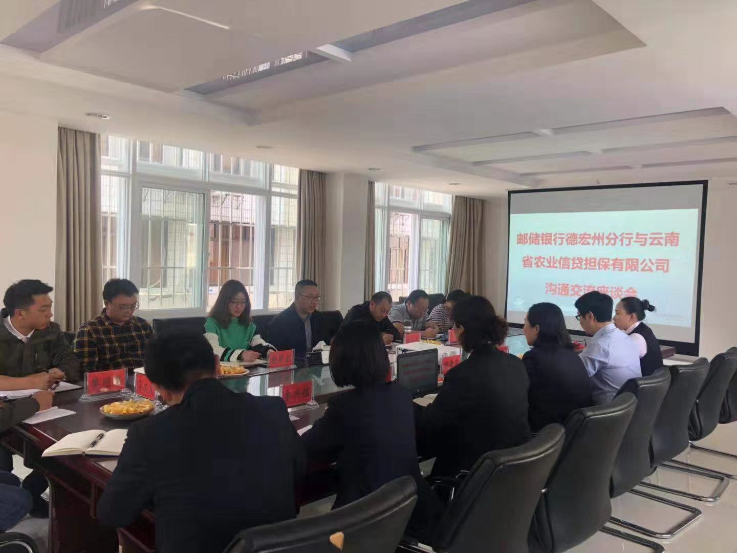 2019年2月19日下午,農(nóng)擔公司副總經(jīng)理廖寅皓、風控部負責人張長浩、農(nóng)擔二部負責人賈萬文、機構(gòu)合作部負責人蔡菲帶領(lǐng)德宏辦事處人員至郵儲銀行德宏州分行,與郵儲銀行德宏州分行副行長鄭素霞,小企業(yè)金融部總經(jīng)理劉娜,個貸部總經(jīng)理吳剛林進行交流座談。