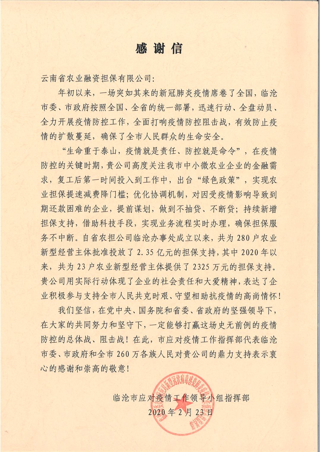 2月23日,臨滄市應對疫情工作領導小組指揮部向云南農擔公司發(fā)來致函,對在新冠肺炎疫情期間,公司積極履行職責,為臨滄市新型農業(yè)經營主體融資需求紓困,表示由衷感謝。今年以來,公司為臨滄市23戶農業(yè)新型經營主體提供了2325萬的擔保支持,并在疫情期間出臺“綠色”政策,積極扶持新型農業(yè)經營主體共渡難關。