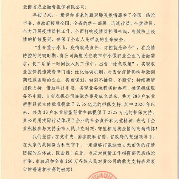 臨滄市應對疫情工作領導小組指揮部向云南農(nóng)擔公司發(fā)來感謝函。