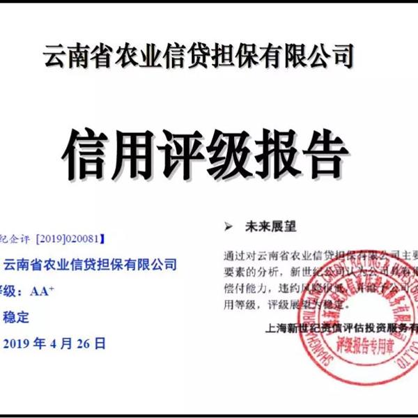 云南省農(nóng)業(yè)信貸擔(dān)保有限公司獲得AA+企業(yè)主體信用評級